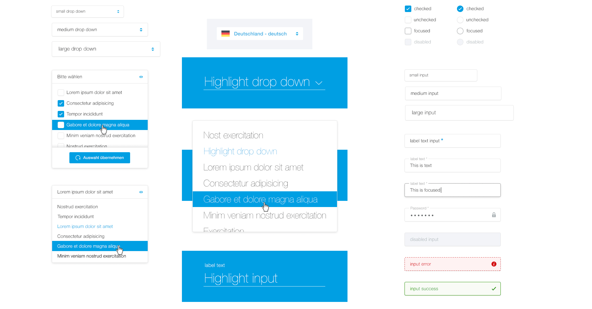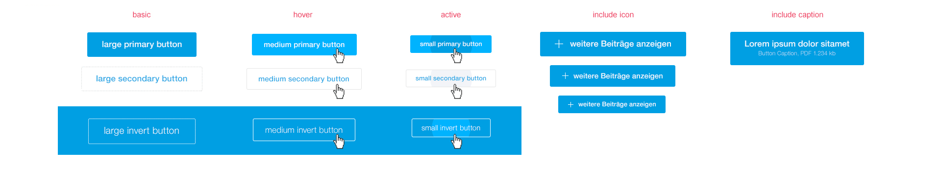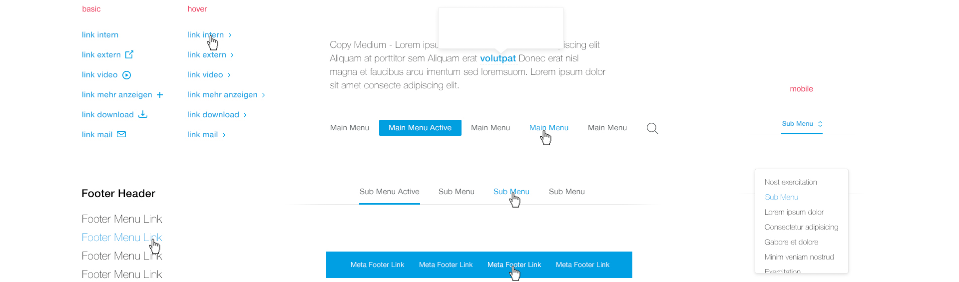 Buttons are used to highlight the user's interaction options. Buttons are available in different sizes and shapes and provide visual feedback on their status. As is usual for MEIKO, the colour choice is limited to the main colour, blue. Buttons and links can be used with or without icons.