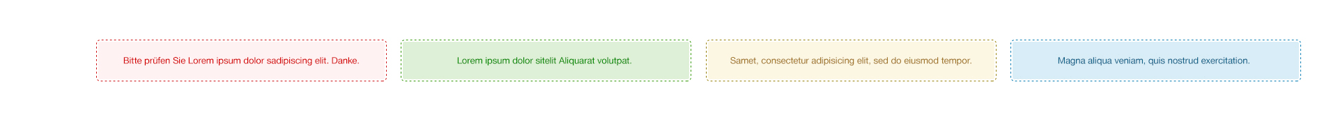 Notifications help the user to enter data. Depending on the type of notification, it may appear in red, green, yellow or pale blue with rounded corners or dotted curves and may feature a white border to separate it from the background colour. The colour values can be taken from the example below. Notifications always appear in the user's focus, as close as possible to the relevant input field. They are clearly formulated and offer help with erroneous entries, give feedback for successfully completed actions or provide hints for interaction possibilities in need of explanation.