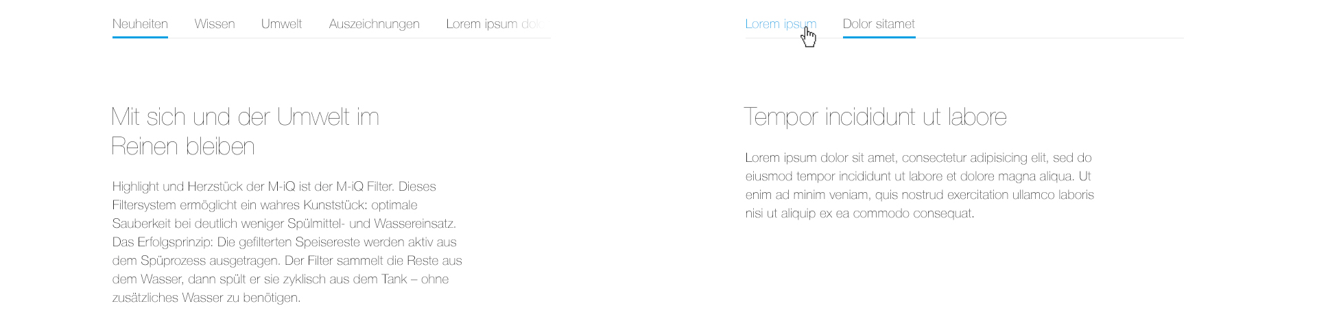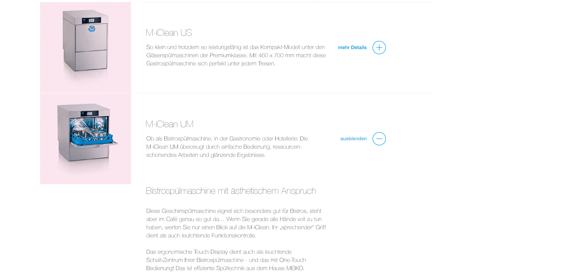 Extensive content can be organised more easily if it is divided into meaningful blocks. Since MEIKO technical products sometimes require more explanation, our UI design includes several such subdivision options, which can be used as required. When using these, however, make sure that only one grouping solution is used within a logical unit.