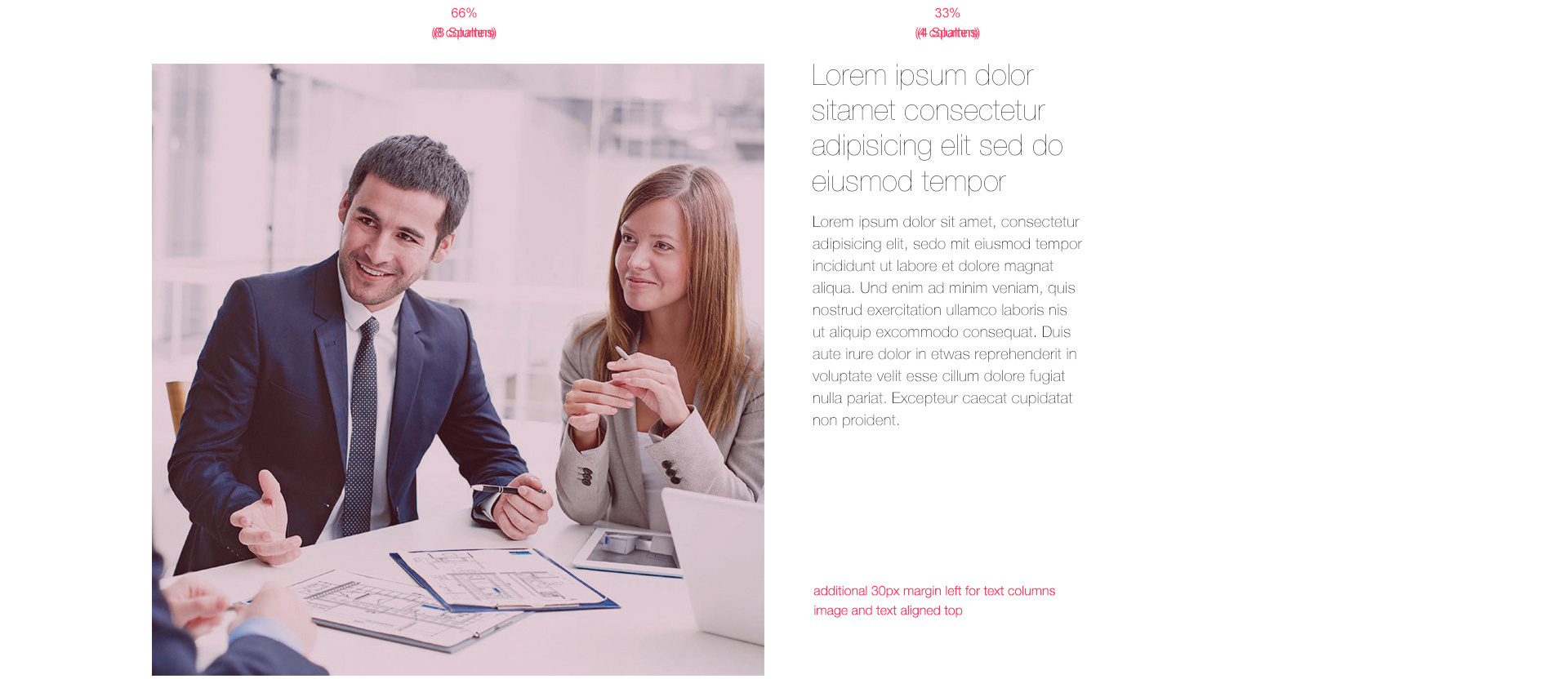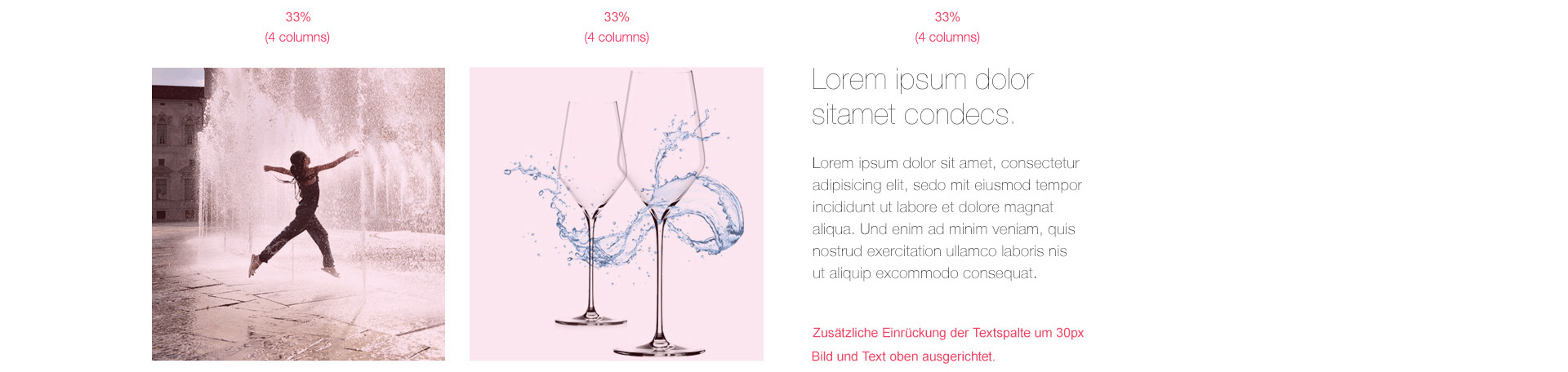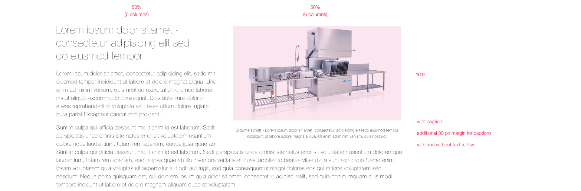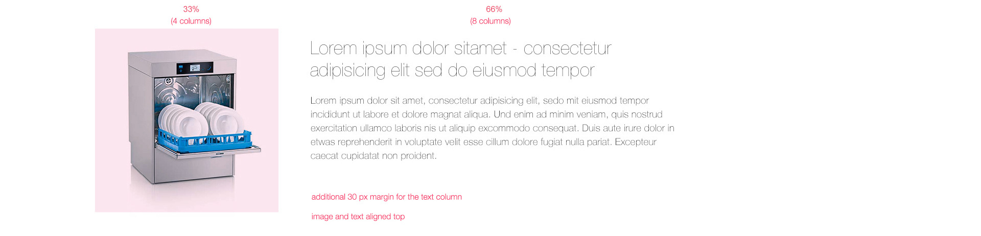 If desired, the MEIKO websites will still use a flexible 12-column grid. Usually the column divisions 50-50, 30-30-30, 66-33 and 33-66 are used as can be seen in the examples.